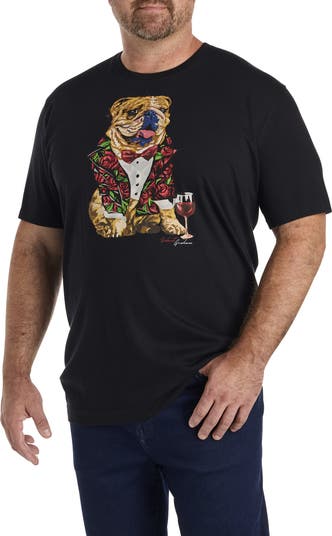 Elevate your casual wardrobe with this sophisticated black T-shirt from Robert Graham. Front and center is the dapper mascot, Great Graham, sporting a rose-printed tuxedo jacket while contentedly sipping red wine. A standout modern look from traditional tees, it's designed with precise proportions and an ideal fit for Big and Tall guys and it adds a playful, yet luxe touch to an otherwise basic black canvas, making it the perfect conversation piece for your next event.