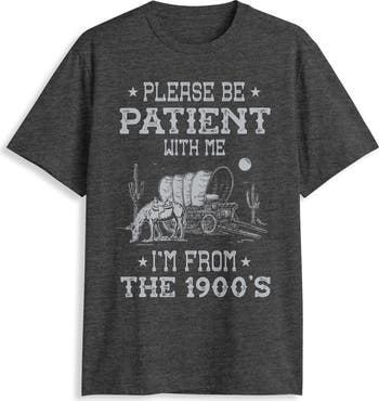 If you're old enough to remember "8-tracks" and records, rotary phones and dial-up internet, you're going to want to add this graphic T-shirt to your collection. Witty and fun, it's designed with a horse and buggy on the front side and the verbiage "Please be patient with me, I'm from the 1900's". An instant conversation starter, it's sure to be a favorite with its roomy comfortable fit and playful hint of sarcasm.