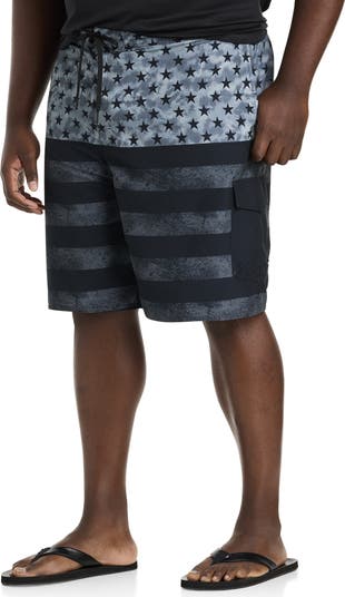 Show off your stars and stripes in this star-spangled style, ready for the water. The perfect patriotic pattern gives a new look to an essential warm-weather style. Crafted of sustainable recycled polyester, these trunks offer UPF sun protection, wick away moisture to dry quickly and have a comfortable, elasticized bend-back waistband giving you the ease you need for a relaxing day poolside, lakeside or at the beach. And, you won't find this style anywhere else, it's exclusive to DXL and designed with precise proportions for Big and Tall guys. Pair it with our coordinating swim top, #94712, for a complete look.Exclusively ours100% repreve polyesterMoisture-wicking technologyUPF sun protectionElasticized waistband at backFunctional fly with velcro closureSide cargo pockets; back zipper pocketUnlinedXL Sizes: 10" inseam; XLT Sizes: 11" inseamMachine wash; imported