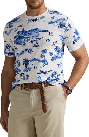Made with soft cotton jersey, this stylish T-shirt from Polo Ralph Lauren features an allover print of Polo’s beloved mascot on vacation, set amidst the scenic backdrop of Hawaii’s picturesque landscape.