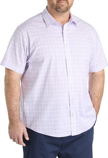 Classic button downs like this one are a staple in every guy's wardrobe. Detailed with a geometric print pattern, this short-sleeve sport shirt looks great from work day to date night. Designed at DXL with precise proportions and an ideal fit for Big + Tall guys, the soft cotton style offers built-in stretch for ease and gives you the freedom to move without restriction. Wear it with shorts, jeans or twills for that effortlessly, put-together look.