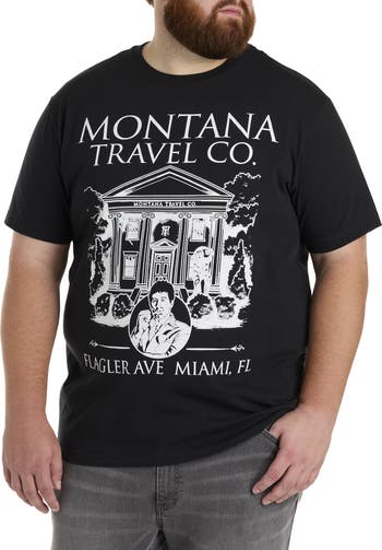 Crafted in 100% cotton and designed for Big +Tall guys with a relaxed, roomy fit, this graphic T-shirt is one that even Tony Montana himself couldn't resist. Designed with a screenprinted chest graphic of the Montana Travel Company on the front side, it's a must-have for Scarface fans. Say hello to our little friend and pair it with shorts, jeans or joggers for big boss style.