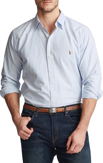 New accents include stripe twill-taped neck seam and side gussets. Multicolor embroidered logo. Button-down collar, back box pleat, barrel cuffs. Cotton. Machine wash. Imported.