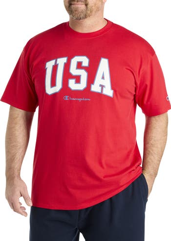 Patriotism, comfort and fine Champion style come together in this graphic T-shirt. Crafted with proper proportions for Big and Tall guys, it features a proud "USA" graphic on the chest and the signature "C" patch logo on the sleeve. Pair it with shorts, jeans or joggers for a complete, casual look.