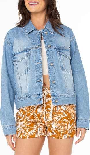 Surf-worthy waves and colorful blossoms are embroidered at the back yoke of this otherwise classic trucker jacket made from light-wash denim.
