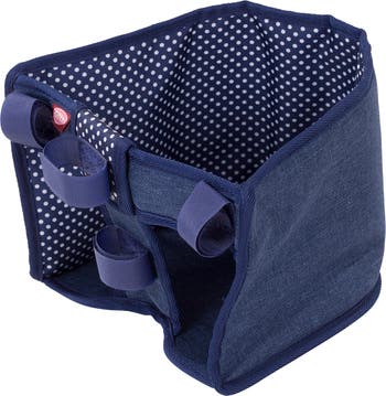 - The seat is made from a tough wipe-clean padded canvas fabric printed with a navy blue exterior and white polkadot patterned interior. .