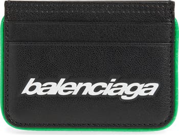 This lambskin-leather card holder crafted in Italy with rounded corners is trimmed with bright-green piping and a sporty white brand logo for a biker aesthetic.