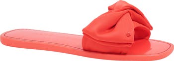 Layered bows offered in a mix of prints and colors pop at the top of a sweet slide sandal.