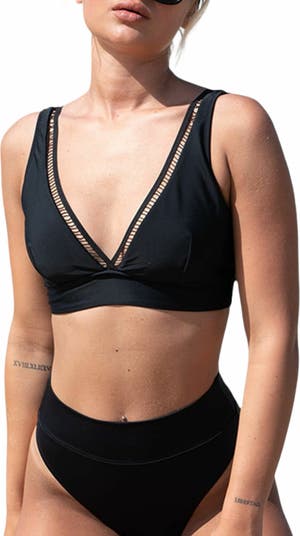 Bikini top with beautiful trimming down the front. Made with a high-quality, Italian Lycra.