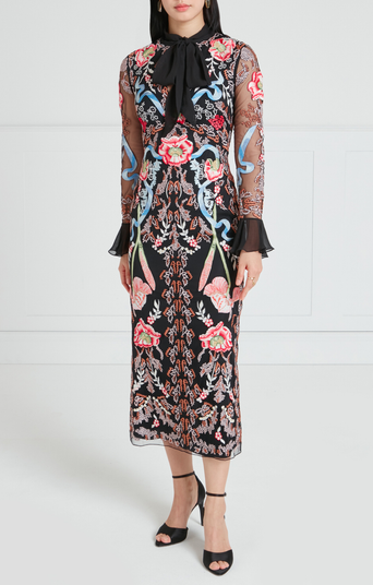 The statement-making, cocktail-length Bilbao tie dress features all-over floral embroidery. It is designed with a feminine bow tie neck and softly flared cuffs, creating elegant volume and movement. The silhouette is versatile for special occasions and distinctive enough to stand out. Exquisite full-stitch embroidery, engineered across the tulle overlay, embodies the essence of Temperley's DNA: timeless design, refined craftsmanship, and a distinctive, feminine flair. The dress is constructed from double georgette and layered tulle, creating a beautiful contrast in texture, with the stretch double georgette providing a flattering fit.