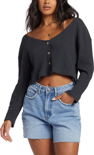 Slouchy dropped shoulders and a boxy fit lend ultimate comfort to a stretch-enhanced cotton-blend top textured with wide ribbing and cut with a dramatic crop.