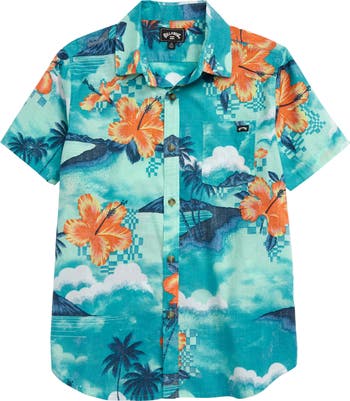 Show off his island style in this breezy cotton button-up styled with vivid tropical blooms.