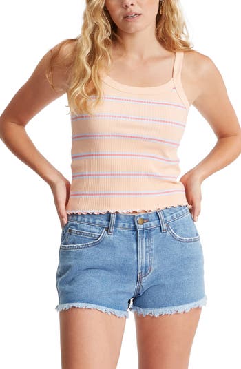 Soft ribbing textures this figure-skimming tank styled in a charming print with a lettuce-trimmed hem.