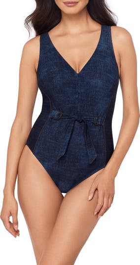 With a denim-fabric and belted waist, this underwire one-piece swimsuit is ready to top your favorites list.