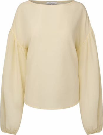 - Drop shoulders and oversized balloon sleeves bring volume to this boatneck top. It’s made from lightweight voile, cut for a boxy fit, and finished with stretch trim at the cuffs. Boxy fit Oversized balloon sleeve Encased elastic at sleeve hem Drop shoulder Boat neck 60% Cotton 40% Viscose Dry clean only.
