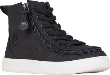 A clever wraparound zipper gives easy access to this kid-sized canvas high-top that will have them out the door and off to school in no time.