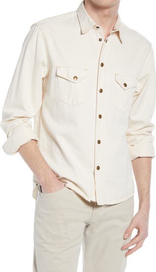 Rugged organic-cotton denim defines a workwear-inspired shirt with antiqued brass snaps for heritage appeal.