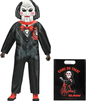 Billy the Puppet (Saw) NECA 6 Inch Scale Clothed Action Figure. The Ben Cooper Costume Kids Collection is back with Series 9, bringing a fresh batch of spooky trick-or-treaters to your shelf! Based on the licensed kids costumes from one of the largest Halloween costume manufacturers from the 1950s80s, these fully poseable 6-inch figures perfectly capture the vintage charm of the looks from that era. This wave features NECAs original designs in the style of Ben Cooper costumes as if they were produced today. Wearing a mask and soft goods clothing replicating the vinyl look of classic costumes, each frightful figure comes complete with a movie-specific trick-or-treat bag or pumpkin bucket accessory. Every figure is sold separately and packaged in a numbered, retro-style window box that pays homage to the classic costume packaging.