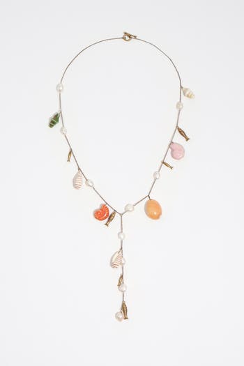 Necklace featuring natural shells and pearls with an engraved logo detail. Finished with a T-bar fastening for a refined, statement look