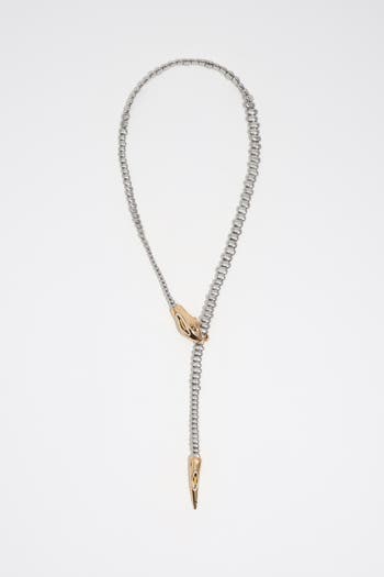 Long metal necklace with a sleek silhouette and engraved logo detail. Finished with an adjustable hook clasp for a refined, versatile fit.