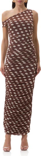 AFRM Biona Printed One-Shoulder Ruched Mesh Maxi Dress, Alternate, color, Chocolate Halo Dot
