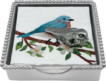 Add a touch of nature to your tablescape with this handcrafted box complete with artfully printed napkins and a bird-shaped weight to hold them in place.