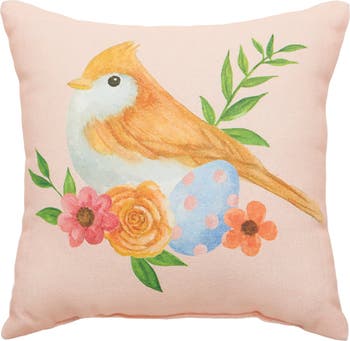 - This charming accent pillow features a sweet watercolor-style bird in golden orange and soft blue perched beside a polka dot Easter egg, surrounded by cheerful blooms in pink, orange, and coral with fresh green foliage, all on a soft blush pink background.