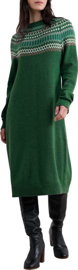 An iconic Fair Isle pattern marks the yoke of this lightweight and cozy sweater dress fashioned with soft merino wool.