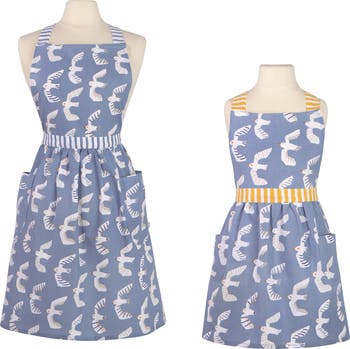 Easy breezy seaside charm swoops in with our Birdie collection. High-spirited, hand-drawn birds and a mineral blue and golden yellow palette capture the joy of flight and fresh air. Set comes with 2 aprons, an adult and toddler apron.