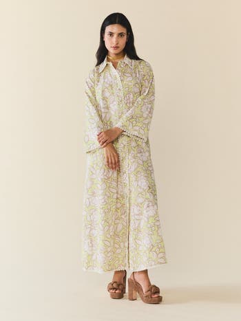 The Birdie Dress is an effortless caftan-style silhouette designed to feel both relaxed and quietly refined. Cut in our Lucca Green floral print, the shape flows easily through the body with a soft structure that moves with you.Delicate lace trim lines the button placket and finishes the sleeves, adding a subtle romantic detail that elevates the easy shape. A soft collar and full button front allow for versatile styling, wear it fully buttoned for a polished look or slightly open for a more relaxed feel.