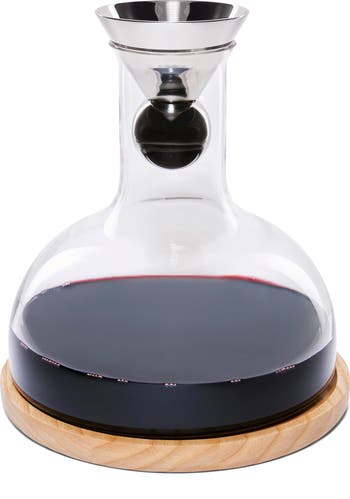 This beautiful decanter aerates wine to enhance aroma and flavor. Made of hand-blown glass, the decanter features a beautifully sized wood base to protect surfaces.