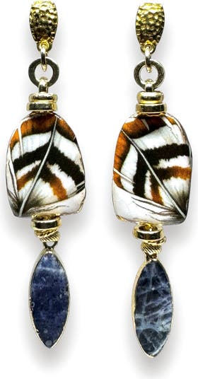 Elevate your accessory collection with these exquisite earrings, a stunning fusion of artistry and elegance. Meticulously handcrafted, each piece showcases a unique hammered post design that lends a contemporary edge to a classic aesthetic. The hand-painted ceramic porcelain shines with gold metallic accents, creating a soft glow that captures the light beautifully. Below, the striking modalite gemstones add an eye-catching contrast, exuding natural elegance. With 18k gold-plated hardware and a lightweight feel, these earrings not only make a bold statement but also ensure comfort, making them perfect for both everyday wear and special occasions.
