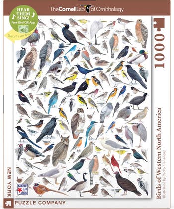Explore 120 of the most common birds of Western North America. This puzzle has them all from the Belted Kingfisher to the Turkey Vulture. Learn more about these birds with a poster sized bird key inside that has a QR code links to all the birds songs, as well as their dimensions and Latin names. This puzzle is a perfect way to explore the bird life that surrounds you.\r\n\r\nThis puzzle comes with an informational poster!\r\n\r\nThe Cornell Lab of Ornithology has developed QR codes which allow you to listen to the songs and calls of hundreds of birds, right from your smart phone. We have harnessed this educational technology to allow you to hear these birds sing while completing your puzzle. The QR codes are on the informational poster inside.\r\nJust download the free Bird QR app and scan the QR codes next to each bird to hear it sing. It’s an interactive way to combine today’s technology with traditional puzzle fun.