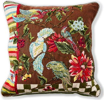 Glass beads and shiny embroidery draw attention to the songbirds perched on this cotton accent pillow.