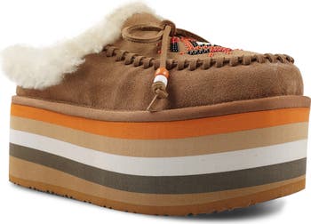 Colorful beading brings boho charm to this faux-shearling moc-toe slipper elevated on a statement striped platform.