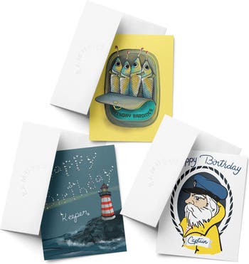 Birthday Assorted Greeting Card Pack (3ct) "Captain, Lighthouse, Sardines"