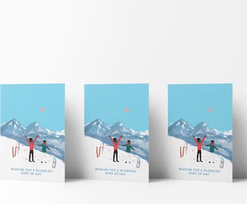 - Front artwork features a ski slope with "wishing you a bluebird kind of day"