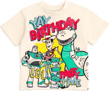 Celebrate your kid's special day with their favorite Disney characters in these stylish Disney birthday shirts! These cute short sleeve tees feature vibrant colors and fun birthday themed artwork with a choice of a Mickey Mouse design with the words "Birthday Boy," Simba from The Lion King with the words "Birthday King," Winnie the Pooh and his friend Piglet with the words "Birthday Bear," Lightning McQueen and Mater from Cars with the words "Birthday Champ," Woody, Buzz Lightyear, Rex, and the Aliens from Toy Story with the words "Yay Birthday" and "Party Time," and a Buzz Lightyear design with the words "Birthday Ranger." Dressed in these soft and comfy tshirts, your Disney fan is ready for an exciting birthday adventure!