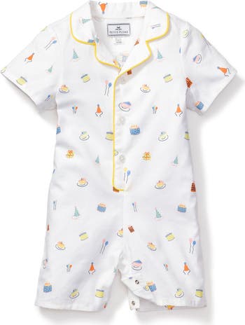 The party doesn't have to end at lights-out in these piped one-piece pajamas made from a cozy brushed fabric printed with cake and presents.