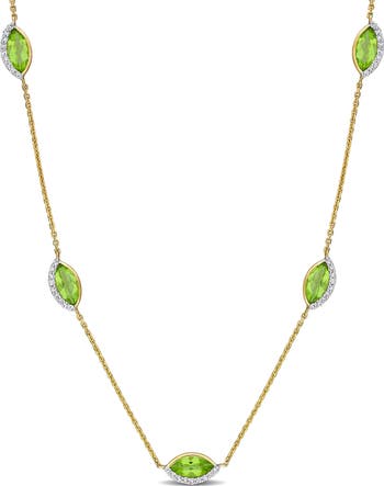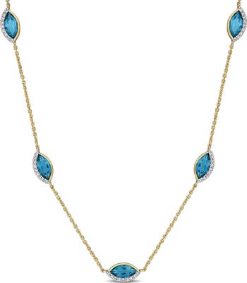 This elegant necklace showcases marquise-cut gemstones, set along a 17-inch 14K gold chain. Each gemstone is enhanced by sparkling round diamonds adding a luxurious touch to the vibrant stones. The rich gemstones paired with the warm tones of gold create a sophisticated and bold design, perfect for adding a touch of timeless elegance and color to any outfit.