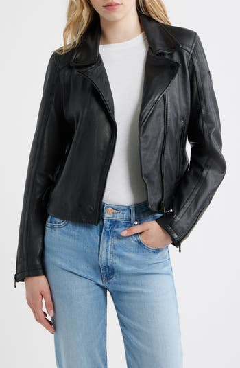 A vintaged, distressed finish and high-contrast zippers bring authentic, open-road vibes to this moto jacket cut for a curvaceous fit that's shaped from buttery soft lambskin leather.