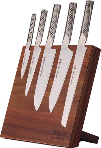 The Global Ukon 5-Piece Knife Block Set is a striking blend of precision, innovation, and modern design. Crafted from high-performance CROMOVA-18 steel, each blade in the set offers exceptional edge retention, razor-sharp performance, and long-lasting durability. Ergonomic handles provide a secure, comfortable grip, making prep work efficient and enjoyable. The set is housed in a stylish magnetic easel that saves counter space while showcasing the knives like a culinary gallery.