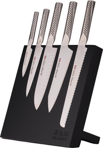 The Global Ukon 5-Piece Knife Block Set is a striking blend of precision, innovation, and modern design. Crafted from high-performance CROMOVA-18 steel, each blade in the set offers exceptional edge retention, razor-sharp performance, and long-lasting durability. Ergonomic handles provide a secure, comfortable grip, making prep work efficient and enjoyable. The set is housed in a stylish magnetic easel that saves counter space while showcasing the knives like a culinary gallery.