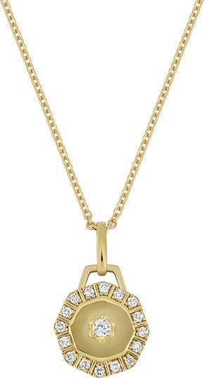 Add sparkle and shine to your look with this handcrafted necklace featuring an octagonal, 18-karat-gold pendant with a ring of prong-set diamonds framing a larger center diamond.