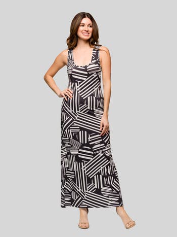 Step out in bold style with the Black and White Razorback Tank Maxi Dress. Featuring a striking geometric print, this sleeveless maxi dress is designed with a scoop neckline and razorback detail for a modern and edgy look. The lightweight polyester blend fabric offers all day comfort, making it ideal for casual outings or relaxed beach days. Pair it with sandals for a laid back vibe or dress it up with heels for a sleek, contemporary outfit.