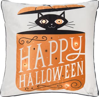 Black Cat in Pumpkin "Happy Halloween" LED Accent Throw Pillow 18" x 18"