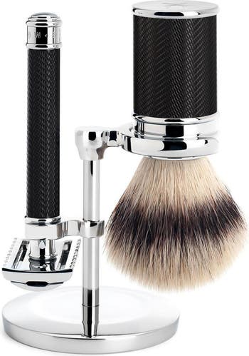 3-piece shaving set without bowl, including: Silvertip Fibre Shaving Brush Open Comb Safety Razor Chrome-plated Metal Stand The iconic MÜHLETraditional Range is a minor marvel of precision, ergonomics and beauty; where classic design meets radiant quality.Long lasting and corrosion-resistant, the MÜHLEchrome choice finish provides incomparable quality and longevity.Silvertip FibreA premium hair grade, this synthetic brush consists of seven different types of fibre, varying in thickness and length. This variation allows for a brush head that, without compromising on backbone, is uniquely soft and easy to manage.Processed by hand, the Silvertip Fibre was created to provide a completely vegan, and lower maintenance product that would emulate all the benefits of a premium natural hair brush head.Easy to care for and easy to use, the Silvertip Fibre brush still produces a thick and creamy lather from small amounts of shaving soap and cream. Unlike natural hair, however, the Silvertip Fibre brush is somewhat more stable and resistant to daily wear. A little more forgiving in its maintenance, the Silvertip Fibre brush dries quickly and is more resistant to shaving soaps and creams.Durable but suitable for even the most sensitive of skin types, Silvertip Fibre is uniquely soft at its fine tips, guaranteeing a gentle and pleasant experience, without compromising on the desired backbone of a quality brush head.Replacement brush heads are available from MÜHLEhere.Open Comb Safety RazorA premium product that produces a distinctly close and lasting shave.Unlike modern blade systems, this safety razor foregoes plastic mechanisms. Growing concern in the effects of disposable plastic makes this set a great choice for the environmentally conscious, reducing both plastic waste and unwelcome environmental impacts, without compromising on precision.The safety razor with open tooth comb was developed specifically for experienced wet shavers, allowing for a vigorous, direct shaving technique. The blade is less likely to become clogged by stubble and residues so is generally preferred by men with denser, stronger beard growth.Blades are easily replaced by unscrewing the head of the Safety Razor. Replacement blades can be purchased from us, we recommend the rust-proof MÜHLErazor blades, a perfect match for this timeless razor.