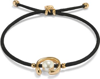 Threaded bracelet in black tones, finished with an 18K gold-plated or silver plated shell pearl accent.