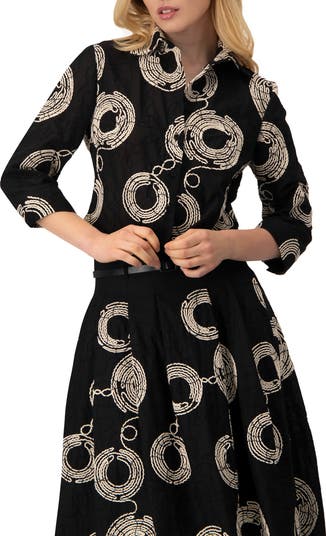 - Stylish black cropped shirt adorned with bold, circular embroidered patterns in a contrasting light tone. Featuring a classic collar, front button closure, and 3/4 sleeves, this piece combines modern design with timeless sophistication