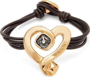 Black leather bracelet with 18K gold-plated heart centerpiece and set of deep black crystals.